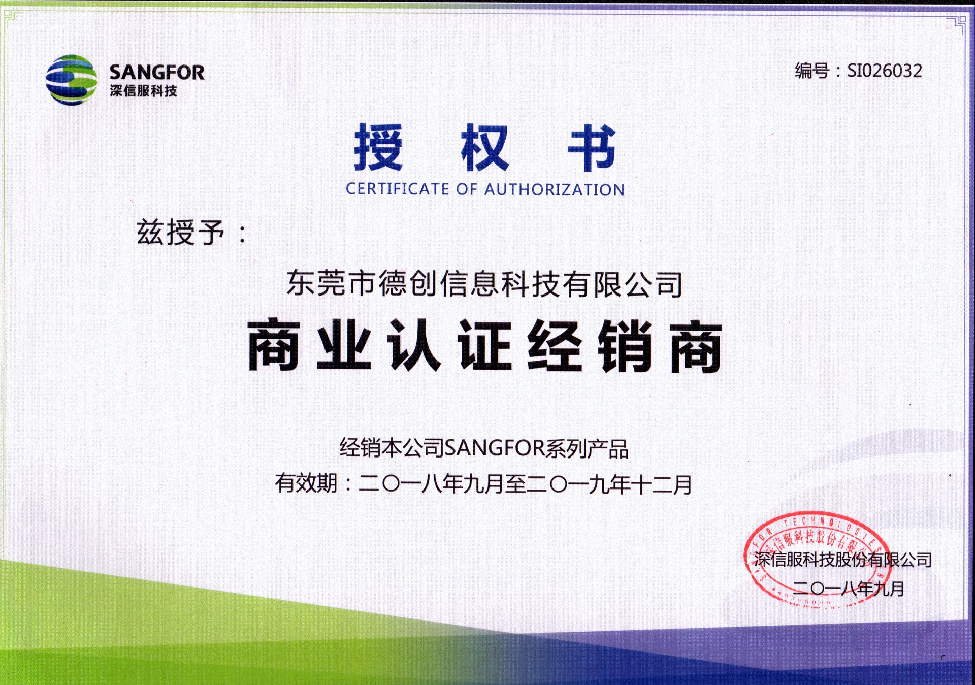 喜訊!德創科(kē)技(jì)榮獲深信服科(kē)技(jì)201¥σ8年(nián)-2019年(nián)商業(yè)認證≠αΩλ經銷商證書(shū)!
