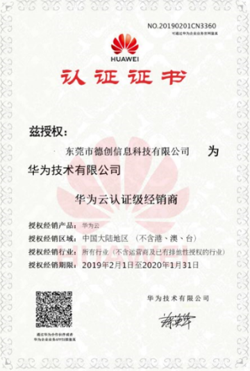 喜訊!德創科(kē)技(jì)榮獲華為(wè"βi)2019年(nián)華為(wèi)雲認£'✘證級經銷商